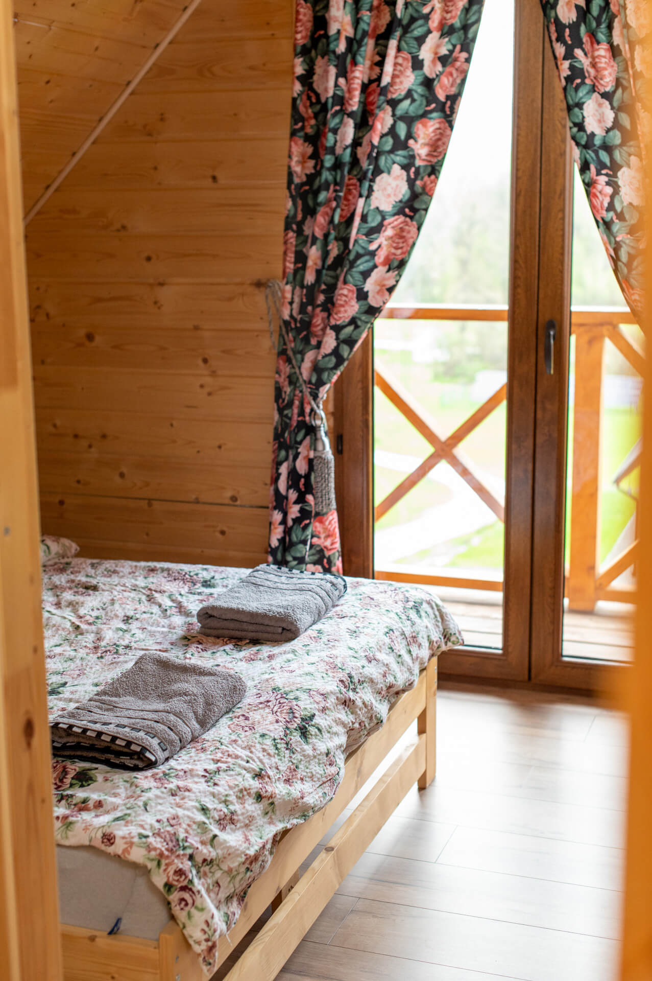 Sypialnia z wyjściem na balkon, z którego roztacza się relaksujący widok na przydomowy zielony ogród. Sypialnia ma podwójne, wygodne łóżko i jest przytulnie urządzona.